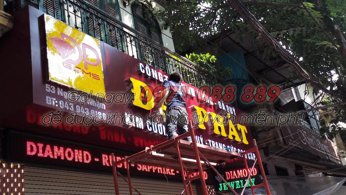 Biển quảng cáo ốp alu, gắn chữ mica nổi có đèn hắt âm bản do công ty Tinh Hoa Việt thi công và lắp đặt cho cửa hàng vàng Đại Phát tại Ngô Thì Nhậm, Hà Nội.