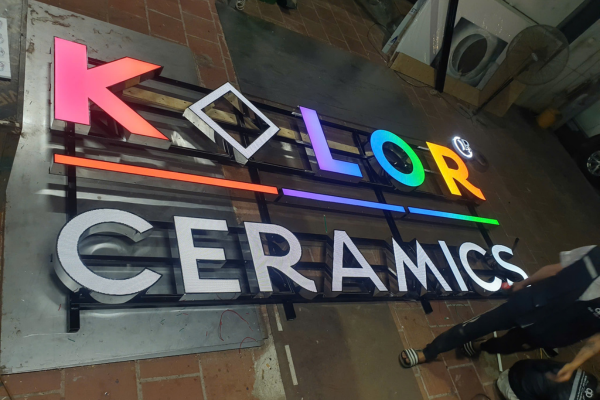 Tại showroom gạch ốp lát cao cấp tại Đống Đa, biển quảng cáo chữ nổi inox mica kết hợp LED giúp: