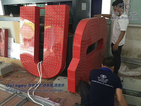 - Sản xuất bộ chữ tại xưởng: Toàn bộ chữ được làm bằng tôn đột dập lỗ led bằng máy CNC, hàn nổi chân bằng máy hàn Laser. Sử dụng công nghệ sơn tĩnh điện cho chất lượng sơn chất lượng tốt nhất, chống chịu thời tiết ngoài trời, chống rỉ tuyệt đối. Gắn led chống nước lên mặt chữ, đi dây đấu nguồn test thử tại xưởng trước khi thi công lắp đặt.