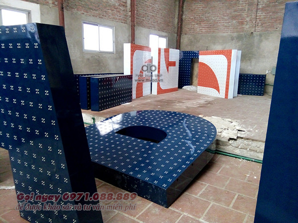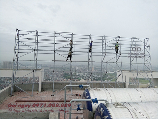 - Phần khung giá đỡ bộ chữ được hàn liên kết từ các loại thép ống, thép hộp, thép V, ... liên kết xuống sàn betong bằng bulong bản mã. Toàn bộ phần khung được sơn chống rỉ 2 lớp.