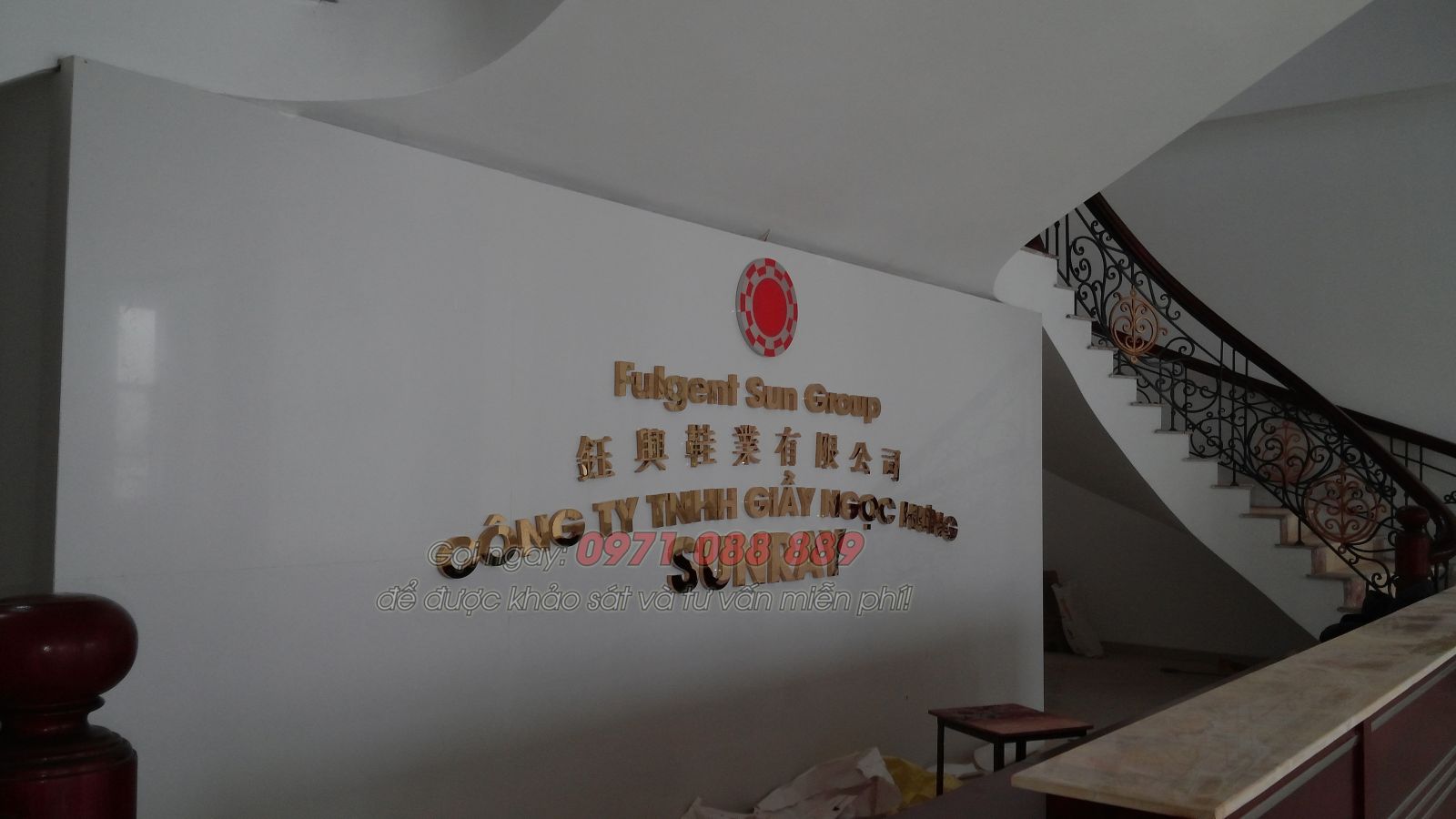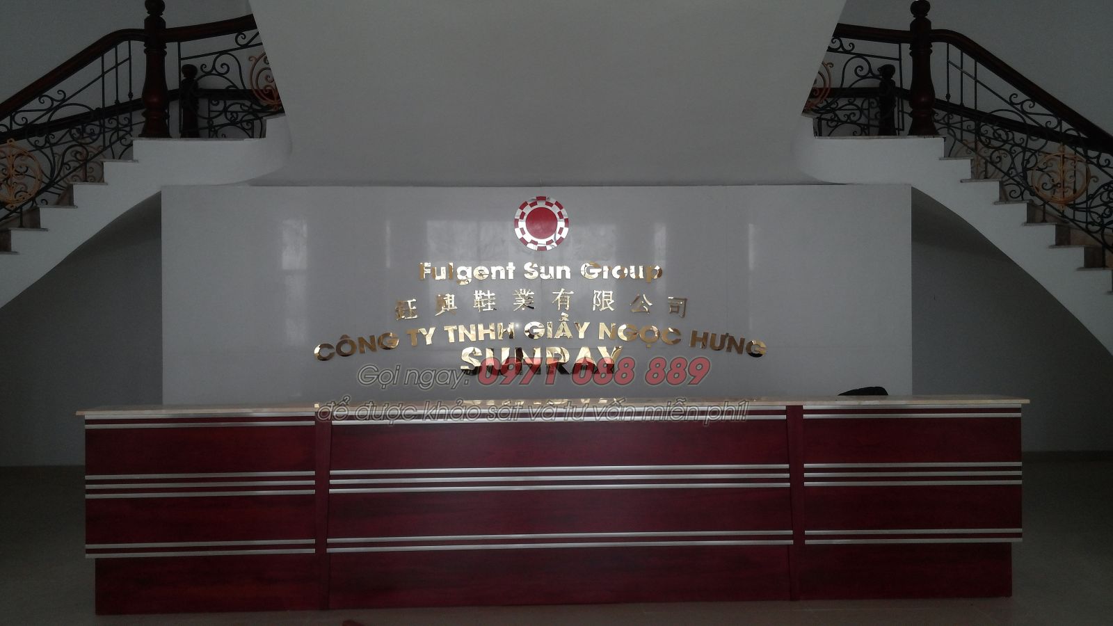 Bên dưới là công trình thi công làm biển quảng cáo chữ inox tại công ty SunRay Giày Ngọc Hưng. Với thiết kế tinh tế, đặc biệt với điểm nhấn chữ vàng giúp cho văn phòng lễ tân của công ty trở nên sang trọng và lịch thiệp.