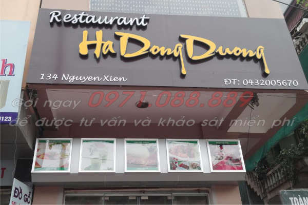 Hệ thống biển quảng cáo cho nhà hàng Hà Đông Dương tại đường Nguyễn Xiển Hà Nội. Hệ thóng biển gồm: Biển ốp alu gắn chử nổi mica led âm bản, biển...