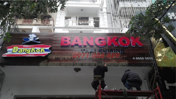 Biển quảng cáo nhà hàng Bangkok Thai Cuisine được làm bằng chất liệu gỗ, mica, alu và đèn led. Nền biển được làm bằng gỗ tạo sự sang trọng và lịch lãm, phần chữ nổi được làm bằng mica trong có gắn đèn led.