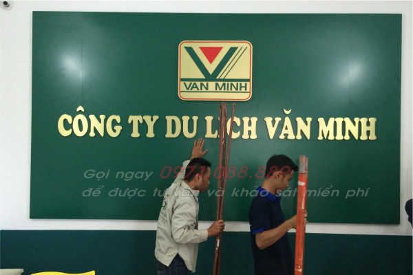 - Chất liệu cảu biển là nền Alu Mãu xanh và Chữ Mica màu vàng. Phù hợp với tông nền chủ đạo của Công ty Du lịch Văn Minh.